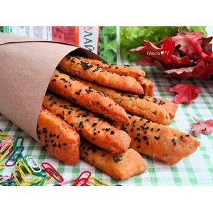 Нарежьте на полоски, смажьте поверхность молоком и посыпьте кунжутом. |