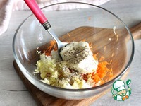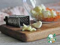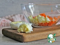 Чеснок очистить, помыть, натереть на мелкой терке, добавить в чашку с натертыми морковью и яйцом. |