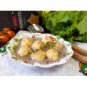 Из теплой поленты скатать небольшие шарики. Для удобства руки лучше смочить водой. В глубокую тарелку вылить ореховый соус и положить шарики из поленты. Подавать сразу же, пока теплые. |