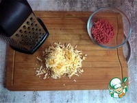 Натираем сыр на тёрке средней величины. Отправляем к колбаскам. |