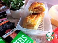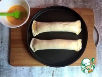 250 г теста делим пополам и немного раскатываем. Выкладываем начинку (см. фото). |