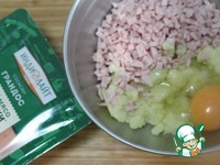 В чашу выложить картофельное пюре, добавить сосиски, чесночный порошок, яйцо и соль. Перемешать. |