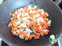 На горячую сковороду наливаем масло, кладём лук и морковь, обжариваем на среднем огне до мягкости, около 10 минут. |