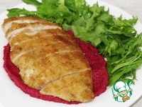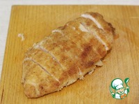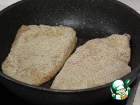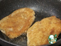Куриное филе разрезать вдоль на две части, слегка отбить, посолить и запанировать в сухарях. |