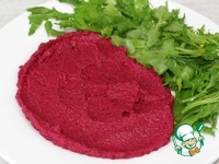 Сервируем блюдо. На тарелку выложить свекольно-сырный крем и порванные листья салата. Салат сбрызнуть оливковым маслом. По желанию можно посолить, я не солю. |