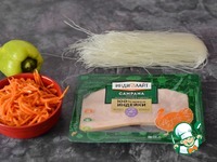Итак, всё что нам потребуется для рулетиков - это ветчина в нарезке, фунчоза, болгарский перец (или свежий огурец) и немного готовой морковки по-корейски. |