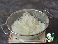 Фунчозу залейте кипятком и оставьте на 5-10 минут, чтобы она набухла. Откиньте на сито и промойте холодной водой. Дайте стечь воде. |