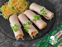 На тонкий ломтик ветчины с одной стороны положите салат из фунчозы. |