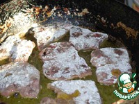 Затем обмакиваем кусочки в муке и обжариваем на растительном масле. Солим каждый кусочек уже непосредственно на сковородке. |