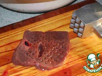 Печень режем обязательно поперек волокон и слегка отбиваем. |