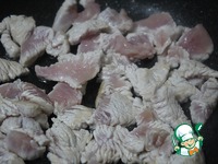 Обжарить индейку вместе с луком в топленом масле. Я лук не добавляла. Отдельно обжарить шампиньоны. У меня были готовые замороженные жареные шампиньоны. |