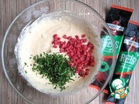 Добавьте мелко нарезанные колбаски и петрушку. |