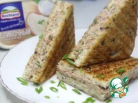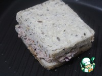 Выкладывем на разогретый гриль тост намазанной стороной вниз. На тост выкладываем треть тунцовой массы и прижимаем сверху тостом смазанной маслом стороной вверх. |