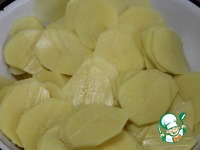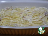 Выложить картофель в сливочно-сырную массу и перемешать. Мешать руками, чтобы каждый ломтик картофеля искупался в сырной массе. |
