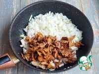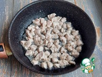 Тем временем приготовим начинку. Куриное филе нарезать небольшими кусочками, переложить в сковороду смазанную растительным маслом. Обжаривать до тех пор, пока не выпарится вся жидкость. |