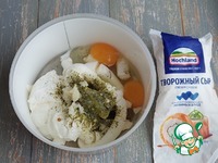 В отдельной емкости соединить творожный сыр тм Hochland, сметану, яйца, соль (регулируйте по своему вкусу) и специи. |