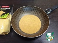 Поленту поджарить на сухой сковороде до бежевого цвета. Следите и мешайте, иначе может подгореть. По времени буквально пару минут. |