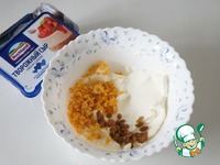 Смешать творожный сыр и сухофрукты. У меня мелкопорезанный манго и светлый изюм. Можно взять другие на ваш вкус. |