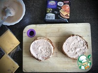Осталось только собрать сэндвич. Смазать каждую булочку (с поджаренной стороны) щедрым количеством острого майонеза. |