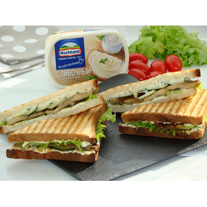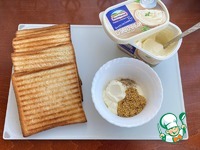 Тостовый хлеб подсушите на гриле. Плавленный сыр ТМ "Хохланд" сливочный, смешайте с горчицей и черным молотым перцем. |