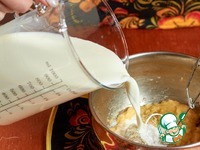 Добавить часть молока, смешать до однородности, вылить все остальное. |