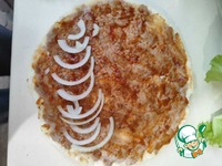 Готовую лепешку с фаршем немного охладить и можно начинать собирать бургер. Сторону с прожаренным фаршем смазываем любым кетчупом. И выкладываем лук порезанный полукольцами на одну половину лепёшки |