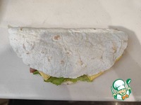 Теперь "прикрываем" пустой стороной лепёшки, сторону с начинкой. При желании можно подсушить на гриле, но имейте ввиду, что сыр от температуры может вытечь. Бургер готов! Приятного аппетита! |
