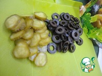 Огурчики и маслины нарезаем кружочками. |