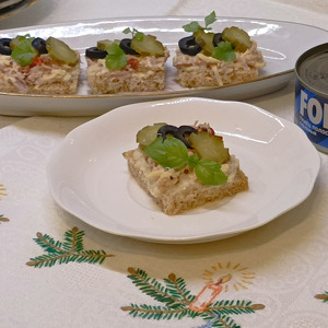 Описание: Тунец полосатый рубленый без масла - идеален в этом рецепте. Именно его постность в сочетании с сыром, майонезом, горчицей и сливочным хреном делают закуску пикантной, но не тяжелой. А огурчики с маслинами добавляют хрусткости. Из пряностей только свежемолотый перец и никакой соли.