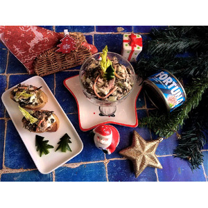 В креманки просто аккуратно выкладываем салат и тоже украшаем сверху по своему вкусу. Я так же вставлю листики сельдерея и из огурца вырежу ёлочки ножом и вставлю посередине. |