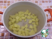 Очищенный картофель нарезать небольшими кубиками, выложить в кастрюлю и залить водой. Кастрюлю поставить на огонь, довести до кипения, снять пену. Варить 15 минут. |