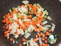Стебель сельдерея, морковь и репчатый лук нарезать мелкими кубиками. Обжарить на растительном масле 5 минут, помешивая (на среднем огне). |