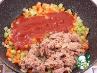 Спустя указанное время выложить к обжаренным овощам кусочки тунца вместе с соком и протертые томаты. Приправить травами и паприкой. Тушить на небольшом огне 5 минут. |