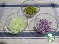 Красный лук и стебель сельдерея мелко порезать. С горошка слить жидкость |