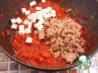 Тунец, слив с него жидкость, разломать на кусочки. Фетаку нарезать небольшими кубиками. Подготовленные ингредиенты переложить в соус, перемешать, прогреть 1-2 минуты и снять с огня. |