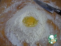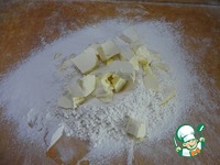 Муку просеять на рабочую поверхность. Сделать небольшое углубление, всыпать в него соль нарезать сливочное масло кусочками. Порубить с помощью ножа до состояния крошки. |
