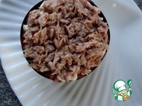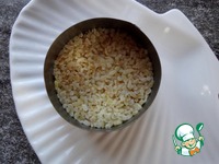 Выкладываем салат слоями в кольцо, салатницу или порционные формы. Первым слоем будет булгур, слегка примять. |