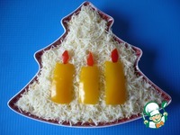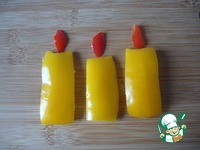 Из желтого болгарского перца вырежьте три полоски, а из красного перца вырежьте "огоньки" - это будет имитация свечей на салате. |
