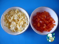 Красный болгарский перец нарежьте мелким кубиком, яйцо куриное натрите на мелкой терке. |