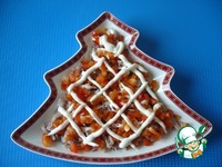 Вторым слоем выложите нарезанный красный болгарский перец, сверху сделайте сеточку из майонеза. |