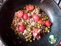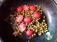 Выкладываем к луку зелёный горошек без жидкости, используя ложку-шумовку. Прогреваем и добавляем черри, разрезав их пополам. Совсем немного прогреваем, чтобы дольки черри не потеряли форму. |