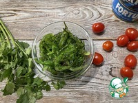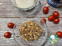 Кольца консервированного ананаса нарежьте на кусочки, помидоры черри разрежьте пополам. |