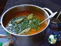 Добавить зелень, лист лавровый, вскипятить и убрать с огня. |
