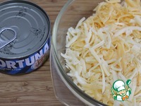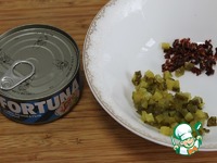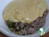 Тунец хорошо обсушить и добавить к овощам. Перемешать. |