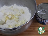 Отжатый тунец смешать с творожным сыром, сметаной, перцем и выложить на тесто, не доходя до краев. Добавить кетчуп и распределить равномерно. |