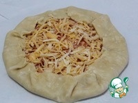 Посыпать сыром. Завернуть края на галету. Духовка разогрета на 200. Выпекать 25-30 минут. |