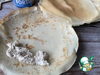 На каждый блинчик выложите начинку и заверните конвертиком. |