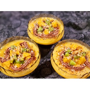 5. Украшаю сверху десерт нарезанными дольками апельсина, киви, присыпаю кокосовой и шоколадной стружкой, а также измельченными грецкими орехами.