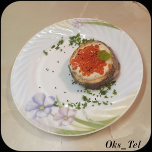Достать готовые стейки из духовки, вынуть из серединки шарик из пергамента или фольги, снять кулинарную нить, залить внутрь соус и сверху выложить икру. Украсить кунжутом и веточками розмарина. |