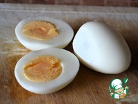 Выложить кашу в тарелку. Сверху выложить половинки яиц. Соль, перец, масло добавить по желанию. |